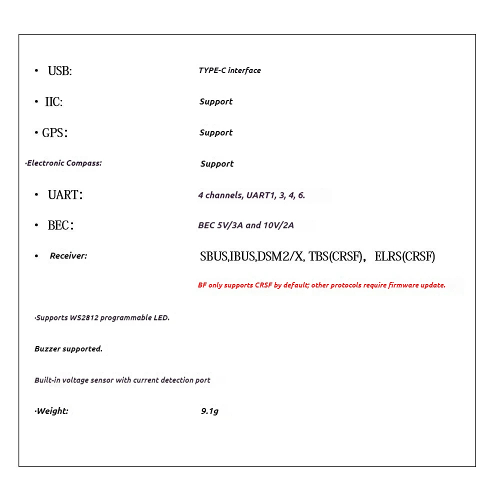Receiver: SBUS, IBUS, DSM2/X, TBS (CRSF), ELRS (CRSF)