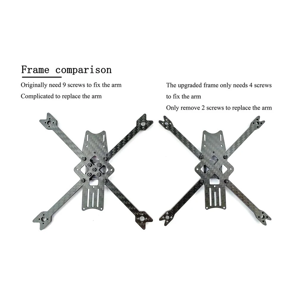 We made seveal upgrades from the frame. First of all, nylon standoffs is upgraded to aluminum alloy standoffs, which strengthens the frame and stables structure.Second, We added the receiver fixing bracket.Third, we upgraded the arms. The arms are upgraded from 4 individual arms (2.5mm thicness) to 2 integrated arms(3.0mm thickness). It is more easy to disassemble, sturdy and durable.Last, the V2 version only needs 4 screws to fix, and the arm can be replaced by removing 2 screws without removing the whole drone.