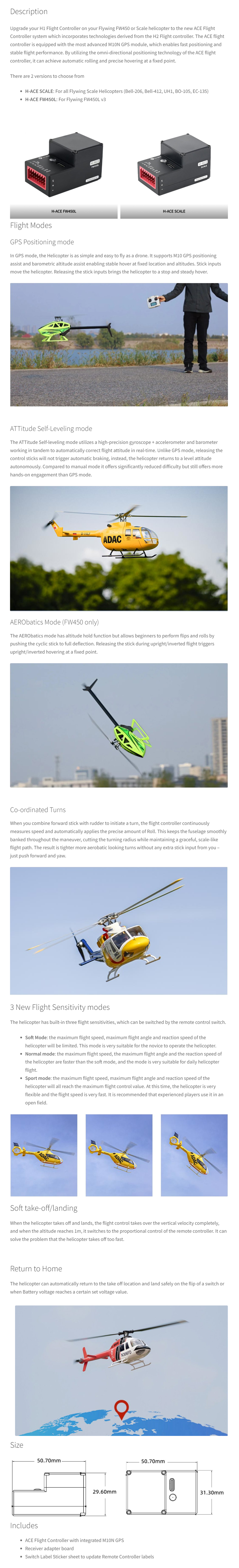 Upgrade your H1 Flight Controller on your FLY WING FW450 or Scale helicopter to the new ACE Flight Controller system which incorporates technologies derived from the H2 Flight controller. The ACE flight controller is equipped with the most advanced M10N GPS module, which enables fast positioning and stable flight performance. By utilizing the omni-directional positioning technology of the ACE flight controller, it can achieve automatic rolling and precise hovering at a fixed point.
