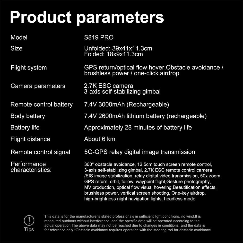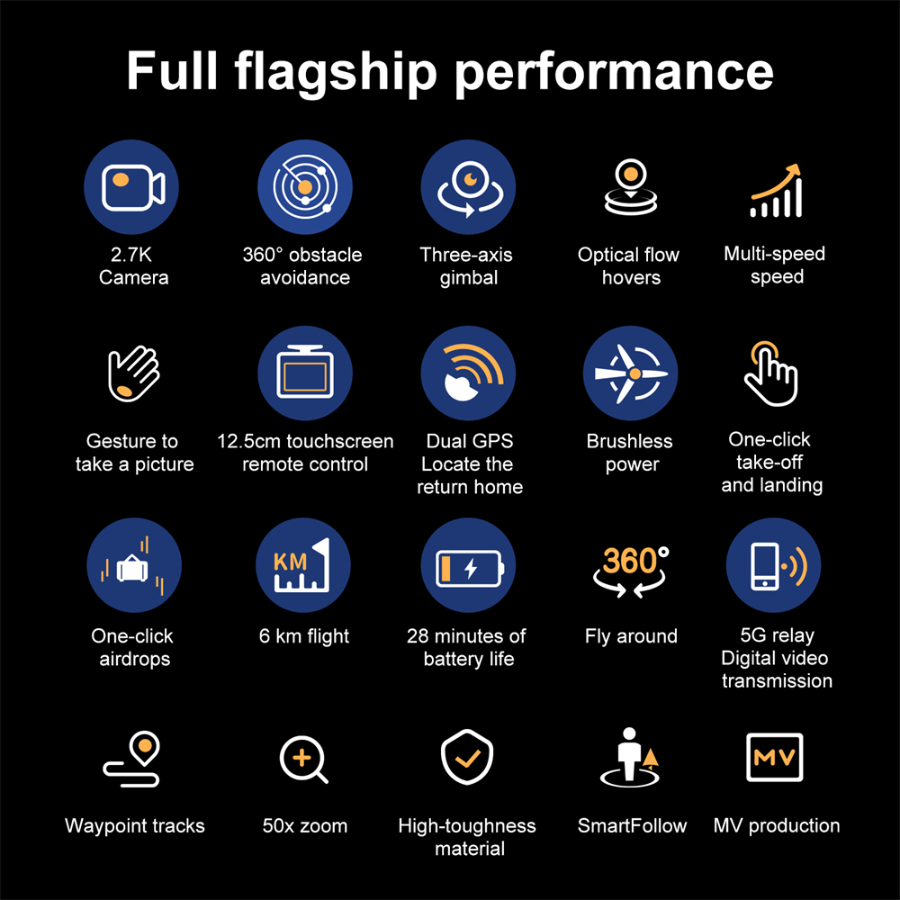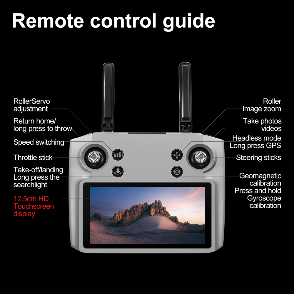 Function: Up/down, Forward/backward, Turn left/right, Sideward flight, 3-level flight speed, LED Light, Headless Mode, One Key Return, One Key Takeoff /Landing, Brushless, Digital Image Transmission, Optical Flow Positioning, GPS Positioning, Follow Me, Surrounding Flight, Waypoint Flight, Obstacle Avoidance, Touchable LCD Screen Controller